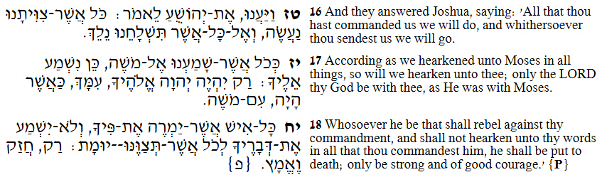 1:16 他们回答约书亚说:“你所吩咐我们行的,我们都必行;你所差遣我们去的,我们都必去。