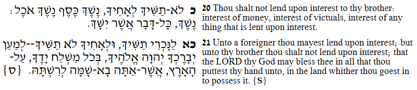 23:20 借给外邦人可以取利,只是借给你弟兄不可取利。这样,永恒主你上帝必在你所去得为业的地上,和你手里所办的一切事上赐福与你。