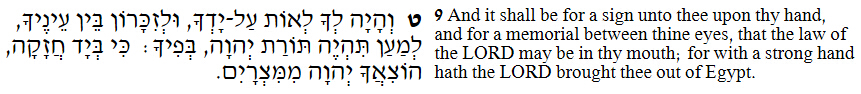 13:16 这要在你手上作记号,在你额上作经文,因为 永恒主用大能的手将我们从埃及领出来。