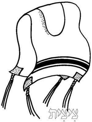 左图:Talit Katan(小型祷告巾),附带四条 Tsitsit(繸子)。